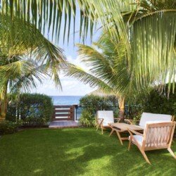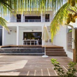 Pour les repas en plein air, une salle à manger extérieure permet de savourer des plats al fresco tout en écoutant le doux bruit des vagues. Un escalier privé mène directement à la plage de Flamands, où l’on peut se baigner ou se promener sur le sable fin.