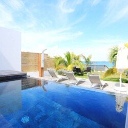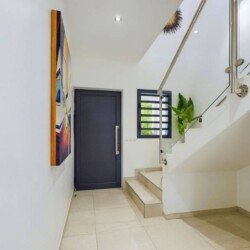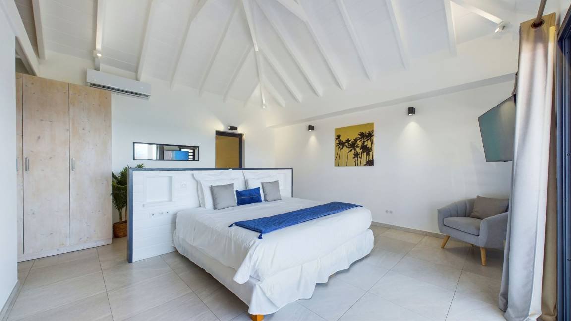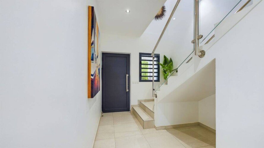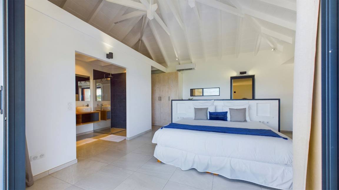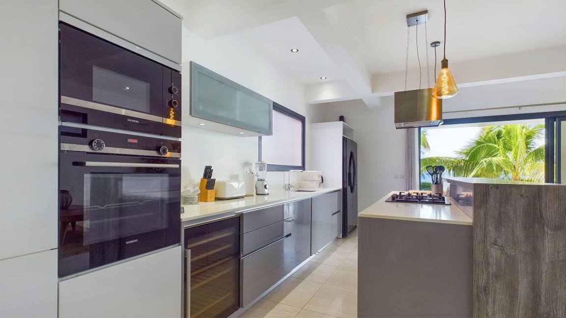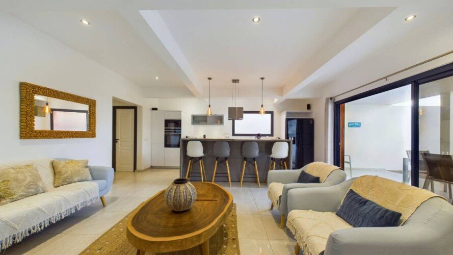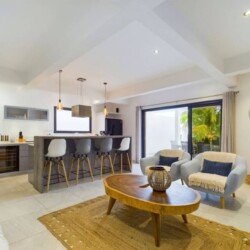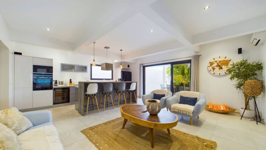 Cette propriété moderne, construite sur deux niveaux, présente un design contemporain qui s’intègre harmonieusement avec l’environnement tropical. Au niveau principal, on trouve un séjour climatisé avec des canapés et fauteuils confortables, disposés face à une baie vitrée qui s’ouvre sur une vue imprenable sur l’océan. La cuisine, équipée d’un bar à petit déjeuner, invite à des moments conviviaux autour d’un café ou d’un encas. La décoration intérieure, lumineuse et épurée, crée une ambiance cosy et relaxante, parfaite pour se détendre après une journée ensoleillée.