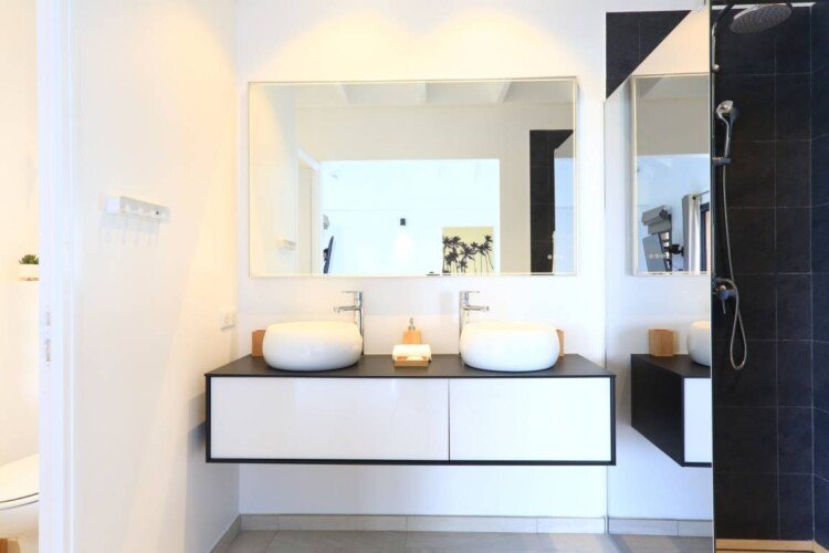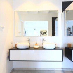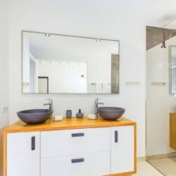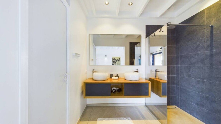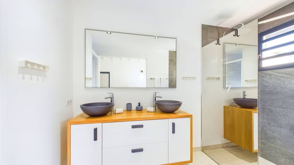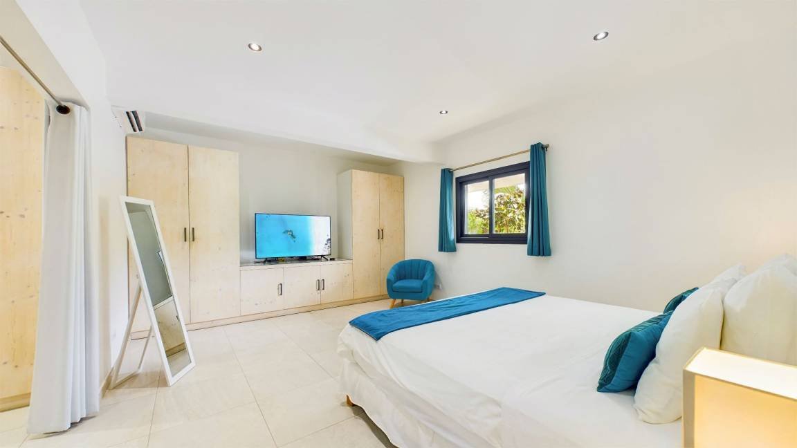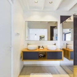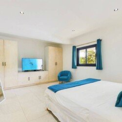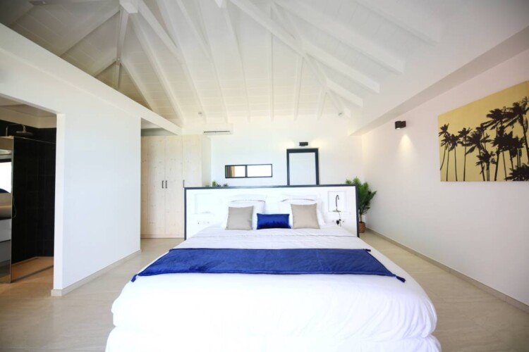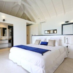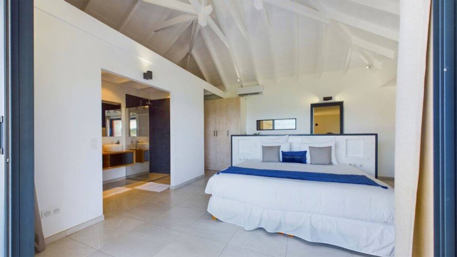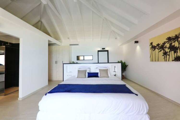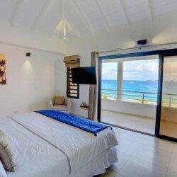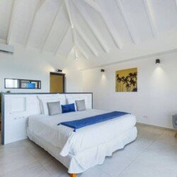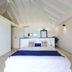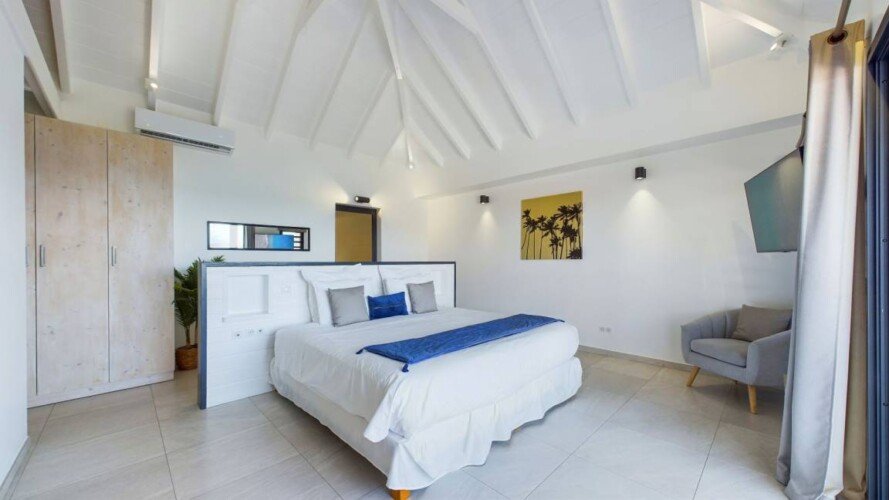 La villa dispose de trois chambres climatisées, chacune avec un lit king size et une salle de bains attenante. La chambre principale, située à l’étage, bénéficie d’un balcon privatif avec une vue à couper le souffle sur la mer. Les teintes poudrées et l’atmosphère paisible des chambres assurent des nuits reposantes et un réveil avec la beauté de la plage de Flamands comme premier spectacle.