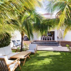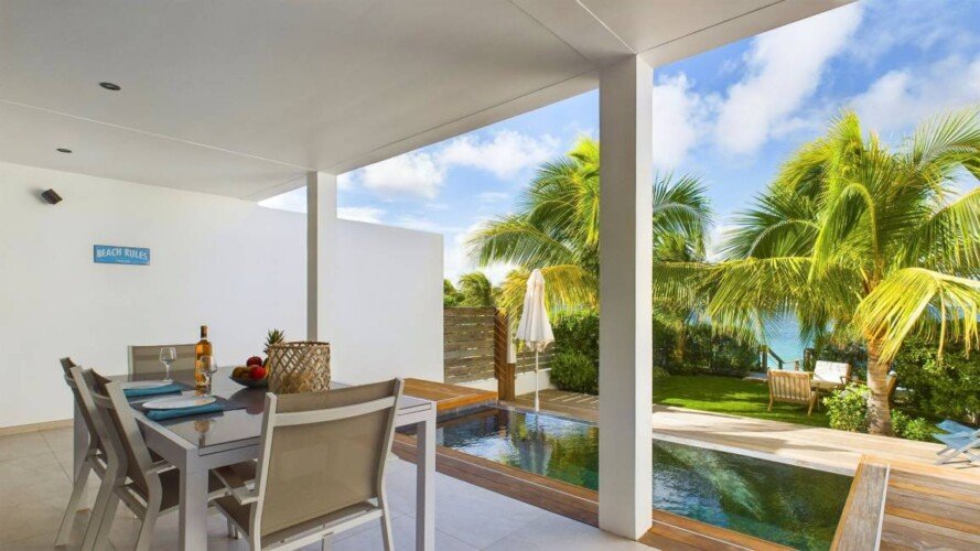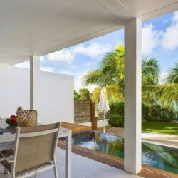 À l’extérieur, la terrasse aménagée propose un espace de détente avec une piscine chauffée à débordement et des transats pour profiter du soleil des Caraïbes. Un jardin tropical avec des palmiers ajoute une touche d’exotisme à cette oasis de paix.