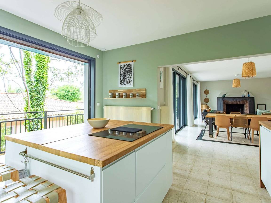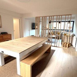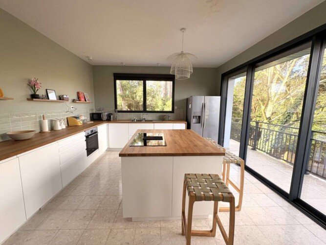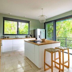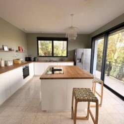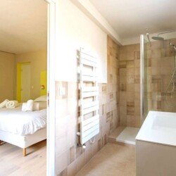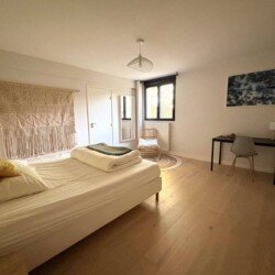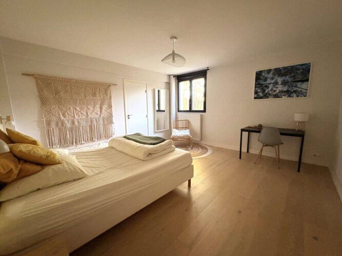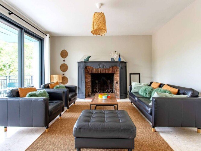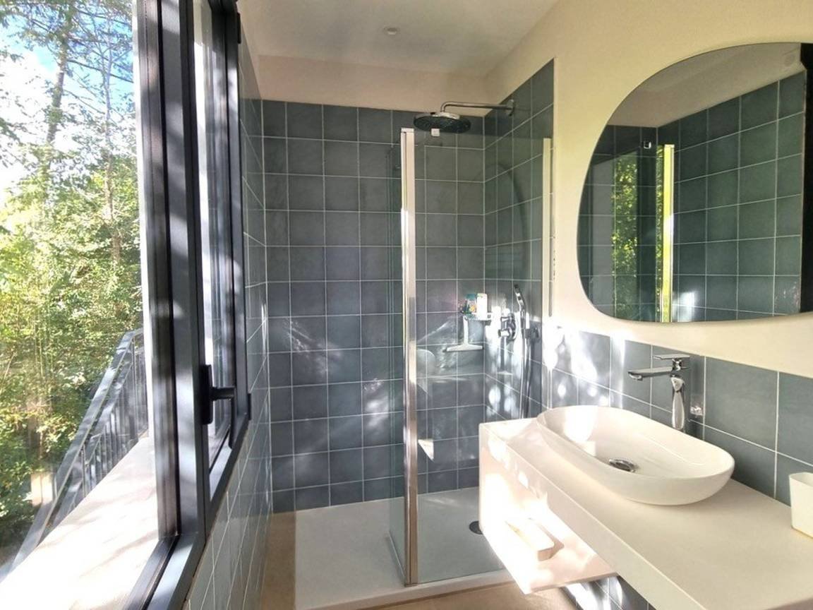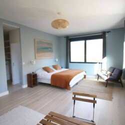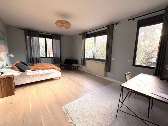 L’étage, quant à lui, donne sur un vaste séjour de 55 m² avec cheminée, une cuisine ouverte (20 m²) offrant un espace de vie éclairé et accueillant, avec un accès au balcon de 30 m² depuis ces pièces. Elle dispose également de trois spacieuses suites parentales : la première (27 m²) équipée d’un lit en 180, un dressing, sa salle d’eau et son WC, la seconde (14 m²) et la troisième (13 m²) sont équipées d’un lit en 140, chacune avec sa propre salle d’eau, ainsi qu’un WC séparé qui vient compléter l’ensemble.