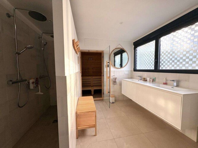 Au rez-de-chaussée, elle dispose d’un grand et lumineux salon de 35 m² avec TV, d’un billard convertible, d’une cuisine d’été (18 m²) s’ouvrant sur une très belle terrasse avec pergola, de trois chambres, dont une suite parentale (19 m²) avec un lit en 180, sa salle d’eau et son WC, d’une grande chambre (20 m²) avec deux lits de 90 convertibles en 180, et d’une chambre avec deux lits de 90 (14 m²). Les deux chambres bénéficient d’un accès direct sur l’extérieur. Une grande salle d’eau équipée d’une double douche, son grand sauna de six places, son WC, une buanderie avec machine à laver et sèche-linge, ainsi qu’un WC indépendant.